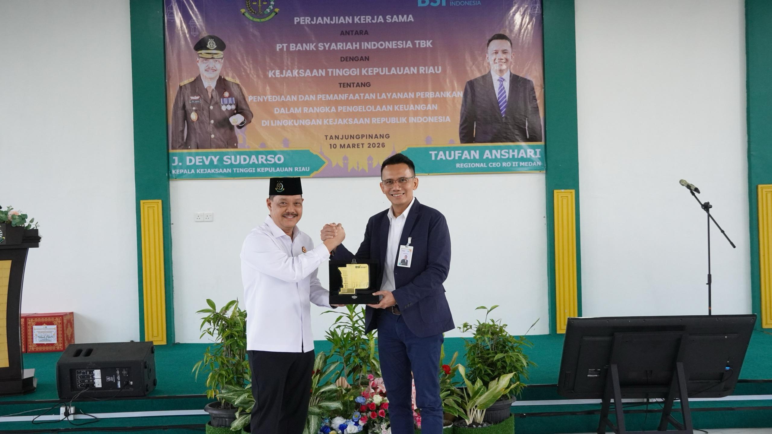 Perjanjian kerja sama ditandatangani langsung oleh Kepala Kejaksaan Tinggi Kepulauan Riau, J. Devy Sudarso, bersama Regional CEO RO II Medan PT Bank Syariah Indonesia Tbk, Taufan Anshari.